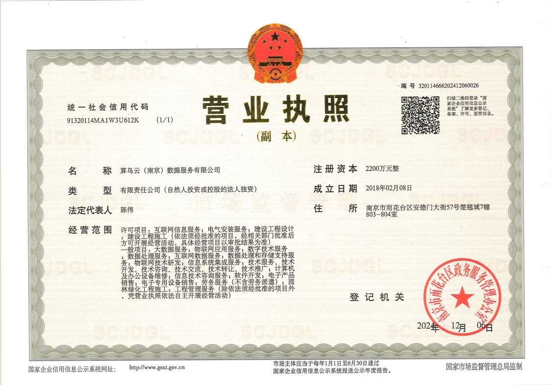 新立訊科技集團(tuán)全資子公司 “南京新立訊物聯(lián)網(wǎng)技術(shù)服務(wù)有限公司”經(jīng)國家市場監(jiān)督管理總局核準(zhǔn),南京市市場監(jiān)督管局登記備案,正式更名為“算鳥云(南京)數(shù)據(jù)服務(wù)有限公司”。