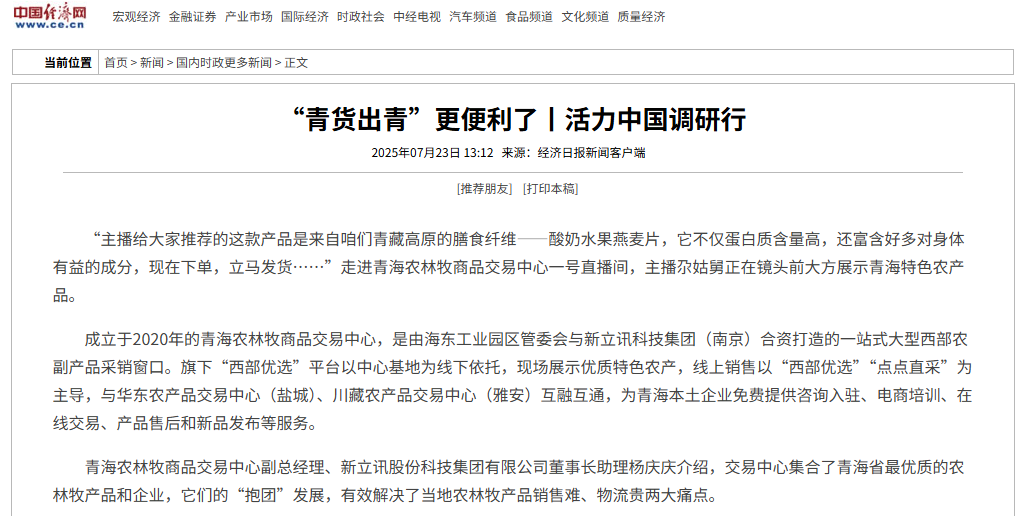 成立于2020年的青海農(nóng)林牧商品交易中心,是由海東工業(yè)園區(qū)管委會與新立訊科技集團(tuán)(南京)合資打造的一站式大型西部農(nóng)副產(chǎn)品采銷窗口。