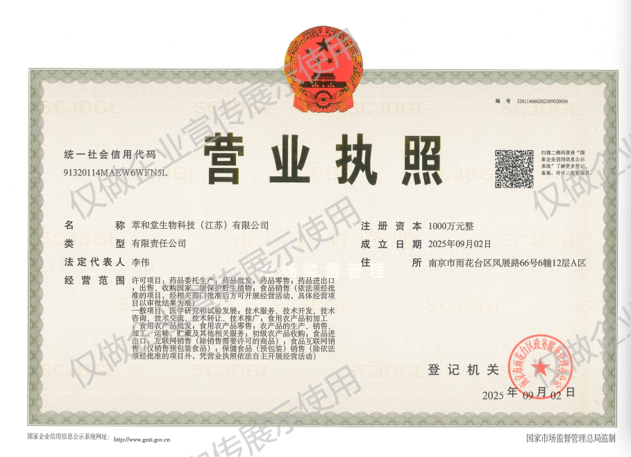 2025年9月2日,萃和堂生物科技(江蘇)有限公司(簡稱“萃和堂”)正式成立,統(tǒng)一社會信用代碼:91320114MAEW6WFN5L,注冊資本金1000萬元。由新立訊科技集團股份有限公司、北京金來順投資有限公司與遵義廖元和堂藥業(yè)有限公司按17:2:1聯合投資設立。“萃和堂”將依托青海省的枸杞、蟲草、鹿茸、黃精等特色農產品資源,深度融合中華老字號“廖元和堂”與“中國非遺”發(fā)酵工藝飲片(含片)生產資質與成熟技術,從初加工農產品到精制加工的中藥飲片(含片)系列大健康消費品,助力“青貨出青”鄉(xiāng)村振興戰(zhàn)略。