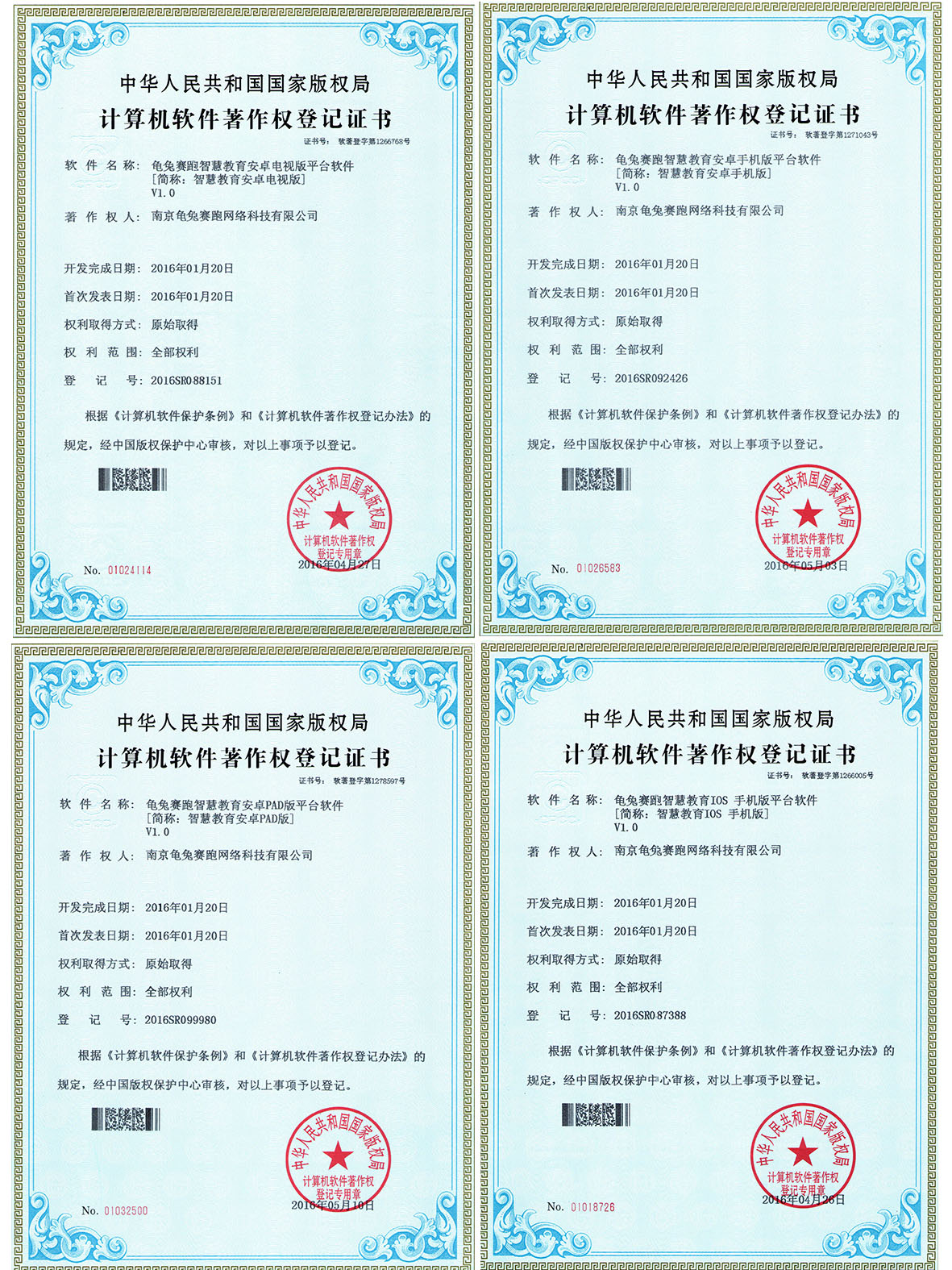 2016年4月27日, 新立訊企業作為自身擁有核心技術、創新能力的國家高新技術企業,公司高新技術研發中心研發團隊所研發的“龜兔賽跑智慧教育IOS手機版平臺軟件V1.0”、龜兔賽跑智慧教育安卓手機版平臺軟件V1.0”、龜兔賽跑智慧教育安卓PAD版平臺軟件V1.0”以及“龜兔賽跑智慧教育安卓電視版平臺軟件V1.0”獲得了由國家版權局頒發的“計算機軟件著作權登記證書”。至此新立訊企業擁有發明專利1項,實用新型專利39項,外觀專利7項,計算機軟件著作權12項,商標3項。