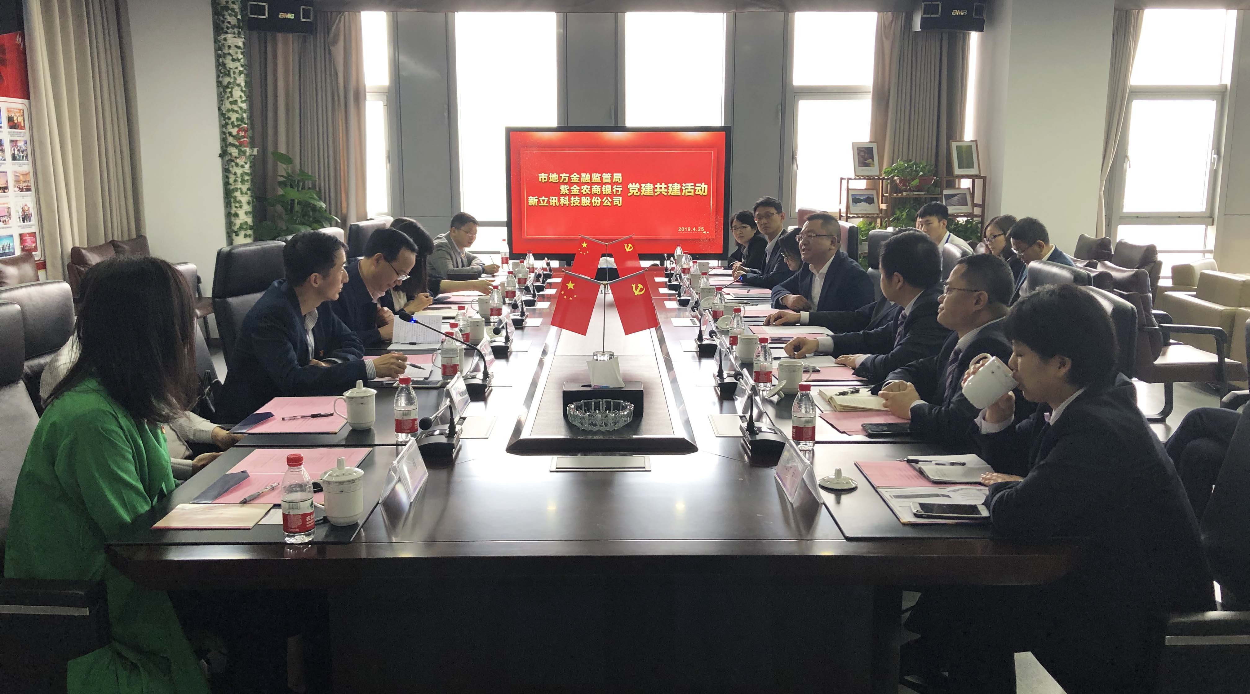 2019年4月25日,南京市地方金融監(jiān)管局、紫金農(nóng)商銀行與南京新立訊科技股份有限公司共同在新立訊總部開展黨建共建活動(dòng)。金融監(jiān)管局黨組書記、局長(zhǎng)劉永彪,紫金農(nóng)商銀行黨委副書記王留平;中國(南京)軟件谷高新局局長(zhǎng)吳瑩;新立訊董事長(zhǎng)毛霖、公司高管層及各方黨員代表等共同參與此次黨建活動(dòng)。共建活動(dòng)由新立訊黨支部書記、副總經(jīng)理李偉主持。