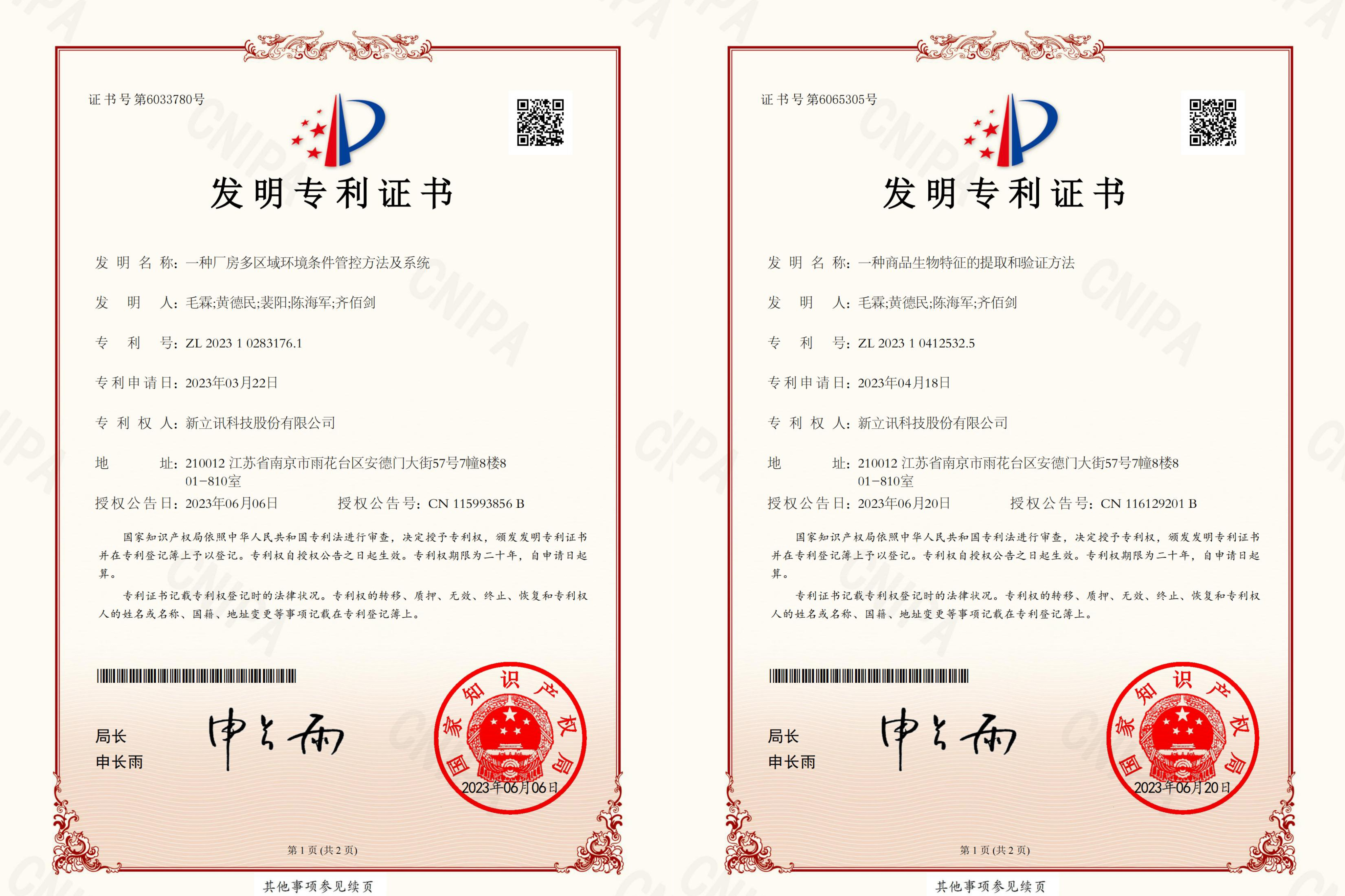 6月,新立訊知識產(chǎn)權(quán)領(lǐng)域新獲兩項發(fā)明專利,分別是“一種商品生物特征的提取和驗證方法”(專利號:ZL202310412532.5),“一種廠房多區(qū)域環(huán)境條件管控方法及系統(tǒng)”(專利號:ZL202310283176.1)和,均為我司原始取得,是技術(shù)創(chuàng)新和研發(fā)方面取得的重要成果。
