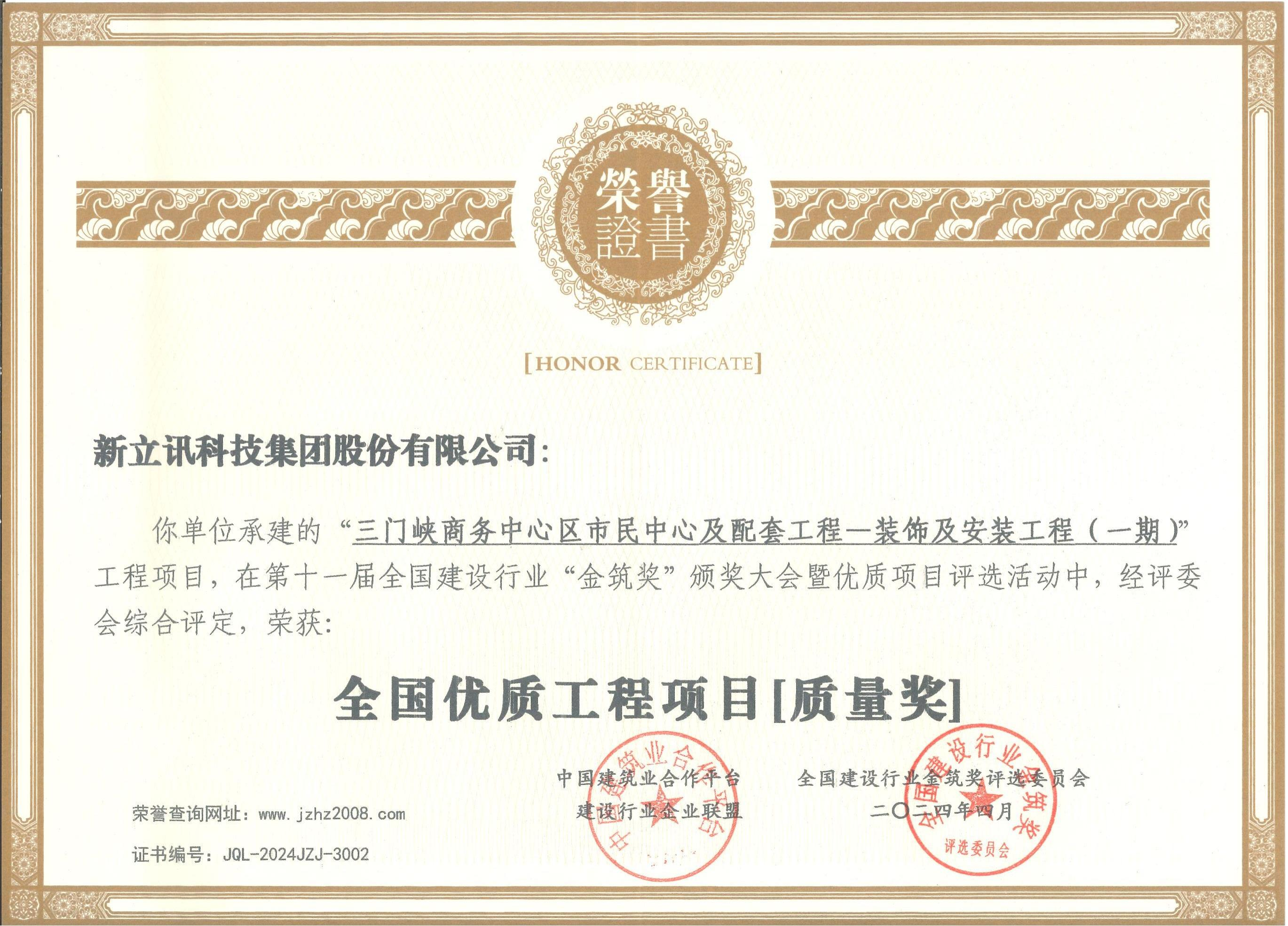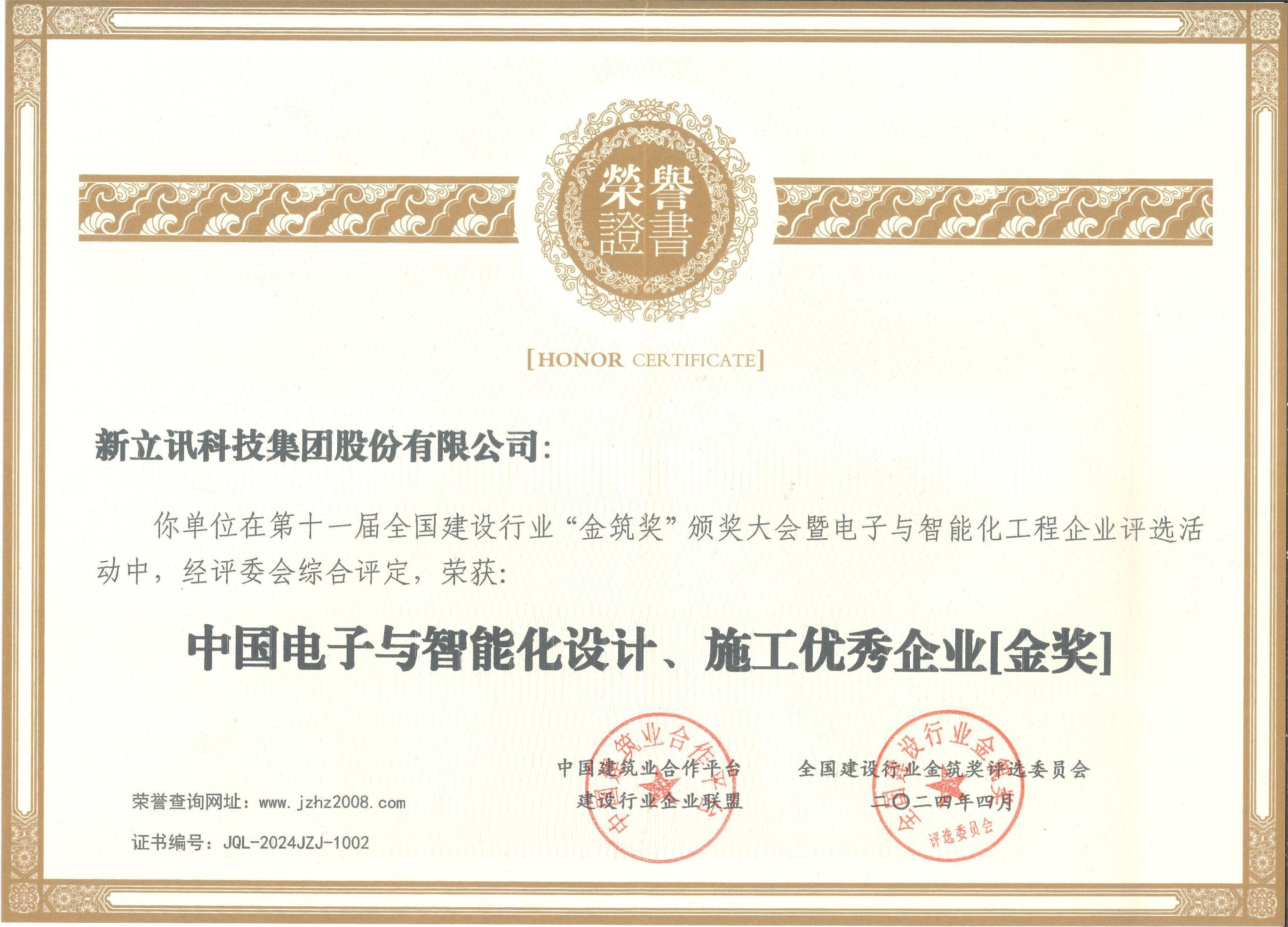 在近日舉行的第十一屆全國(guó)建設(shè)行業(yè)“金筑獎(jiǎng)”評(píng)選活動(dòng)中,新立訊科技集團(tuán)獲榮獲“中國(guó)電子與智能化設(shè)計(jì)、施工優(yōu)秀企業(yè)金獎(jiǎng)”和“全國(guó)優(yōu)質(zhì)工程項(xiàng)目質(zhì)量獎(jiǎng)”雙項(xiàng)。全國(guó)建設(shè)行業(yè)“金筑獎(jiǎng)”評(píng)選活動(dòng)是國(guó)內(nèi)建筑行業(yè)極具權(quán)威性和影響力的獎(jiǎng)項(xiàng)之一。